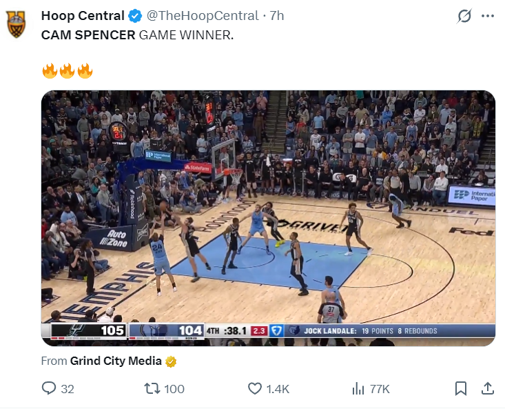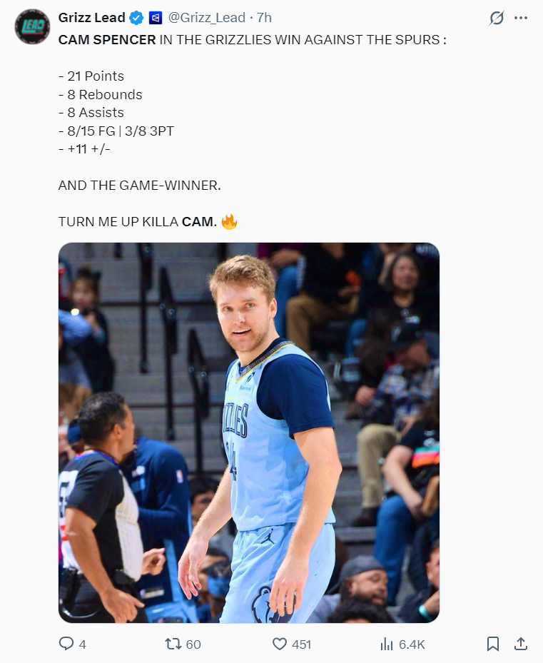 西部第十的灰熊爆冷击败了西部第二的马刺,这场比赛马刺一度领先灰熊11分,而且文班亚马复出爆砍30分5篮板3助攻(21分钟),没想到马刺吞下了一场非常惨烈的失利,决胜时刻马刺全队哑火,被卡姆-斯潘塞一个25岁的小后卫吊打。